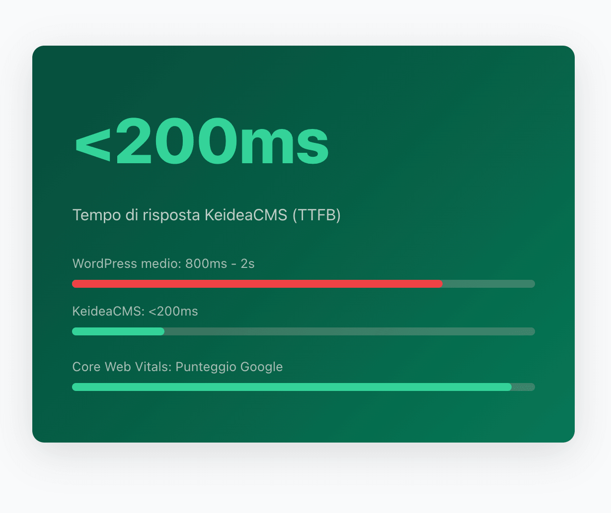 Un sito WordPress medio carica decine di script inutili prima di mostrare il contenuto. Il 53% degli utenti abbandona un sito che impiega più di 3 secondi. KeideaCMS è progettato per essere fulmineo: punteggi massimi sui Core Web Vitals di Google fin dal primo giorno.