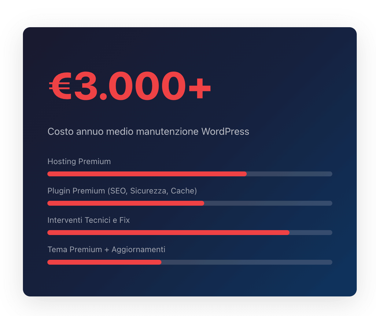| Costo Totale Annuo | Hosting + plugin + manutenzione + emergenze = €3.000-8.000+ | Investimento iniziale + infrastruttura gestita. Zero costi nascosti |